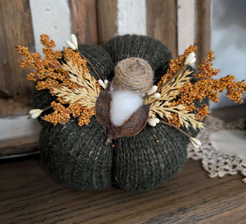 Dark Green Sweater Pumpkin with Fall Top VendorStacy Hutchison Share WhatsApp Deel X Pin it Messenger Email Product form Dark Green sweater pumpkin, about 4.5" tall and 6.5" wide. Read more Dark Green sweater pumpkin, about 4.5" tall and 6.5" wide. Read more 1 in stock $15.00 Quantity Add to cart This item is a recurring or deferred purchase. By continuing, I agree to the cancellation policy and authorize you to charge my payment method at the prices, frequency and dates listed on this page until my order is fulfilled or I cancel, if permitted.